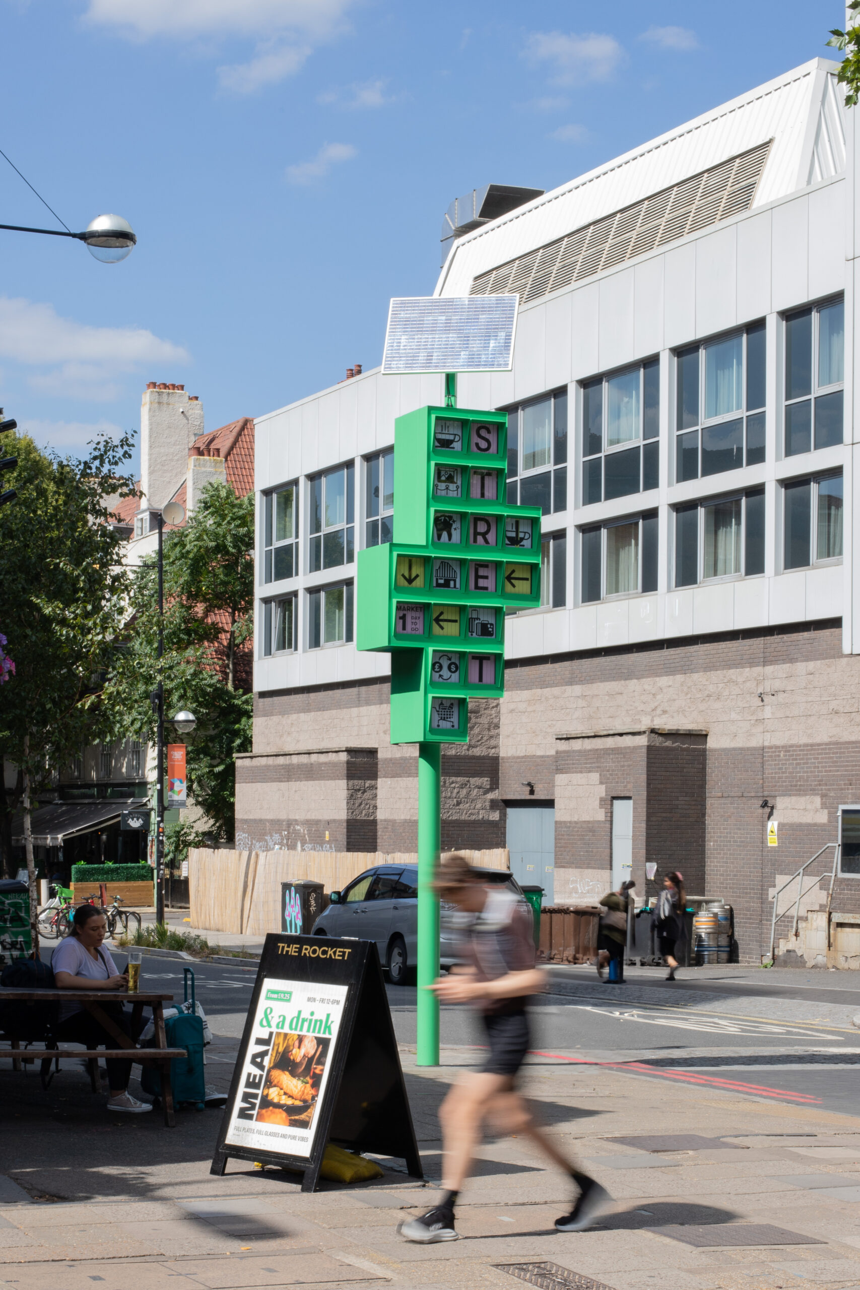 Our new sign for Chalton Street was revealed earlier this summer. Using old-fashioned flip-sign technology, the design can respond to the dynamic cycles of the street. The design developed out of a regular and meaningful consultation process with traders, residents, Euston Town BID and Camden Council officers. The iconography on the sign is generic and advertises a service type, rather than a specific business name. This approach creates a united identity for the street which emphasises its diverse and varied offer. The engaged design process on Chalton Street has galvanised a stronger and more connected community igniting a new determination to reclaim its place as a bustling local destination in the heart of Somers Town.