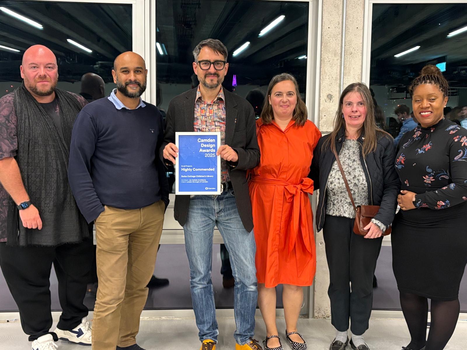 On Wednesday 01/10/25, in a ceremony that took place at the stunning Space House in Holborn, our Swiss Cottage Children’s Library was Highly Commended in the Camden Design Awards. The design was developed with children, parents and teachers from schools in Swiss Cottage and enables a wide-ranging cultural and educational programme to take place at the library. Aside from all the bookshelves, the space now has a crafting and workshop area, a storytelling stage with props and costumes, a magnetic poetry writing wall, a refurbished jukebox loaded with audiobooks and a dedicated space for young people who are growing out of being children. All the furniture is made from natural materials or has been reclaimed and refurbished. Even the giant octopus providing snuggly reading spaces between its tentacles is stuffed with fabric off-cuts from a friend’s denim factory in East London. Teachers told us that children with special educational needs interact with the space through tactility – so we selected textures and finishes that respond to those needs. Read more about the project here.