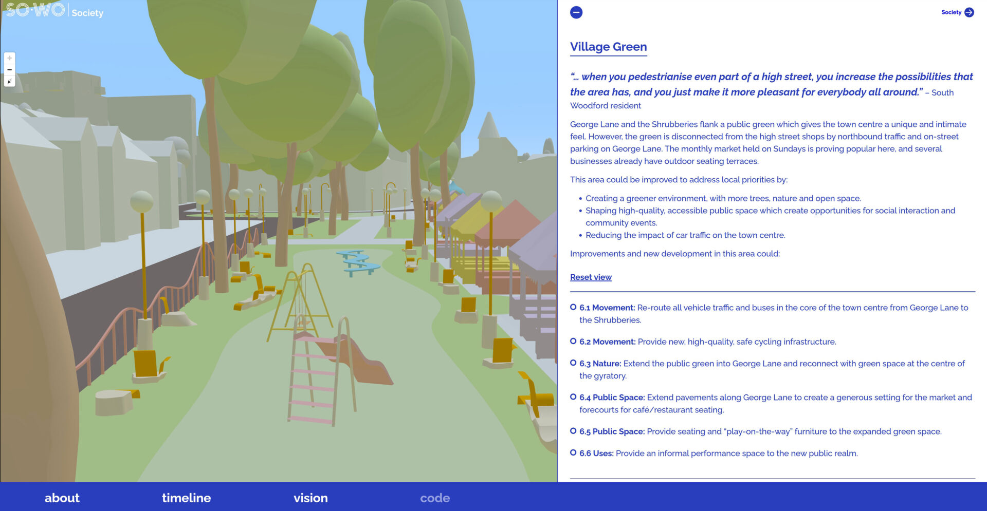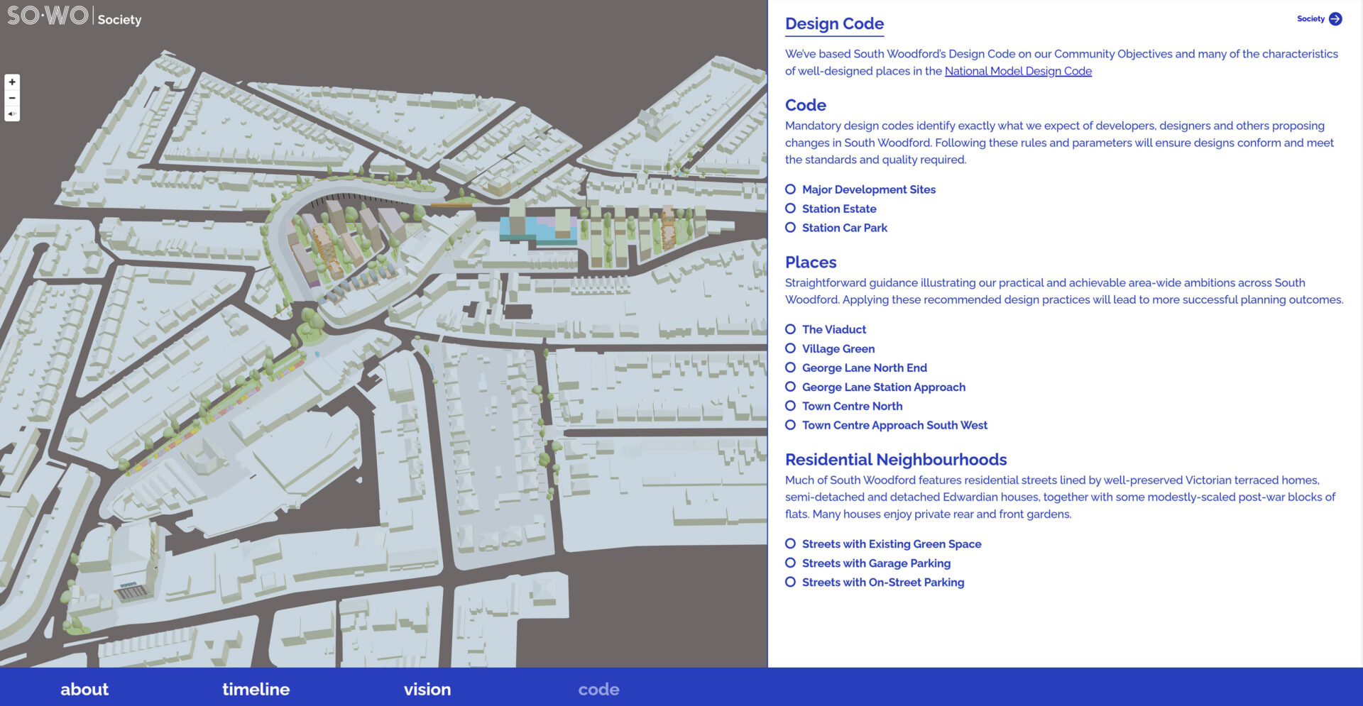 Following further consultation on the draft Design Code with residents, the local authority and central government, the Society was successful in securing further funding to expand the interactivity of the digital interface.
